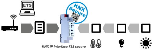 Sa KNX IP Interface 732 secure, KNX magistrali se može pristupiti sa bilo koje tačke LAN-a. Šifrovanje takođe omogućava sigurno programiranje putem Interneta. Uređaj se odlikuje kompaktnim dizajnom širine samo 1 KS (18 mm), a napaja ga KNX magistrala. Dugmad i LED diode na uređaju omogućavaju lokalnu dijagnozu trenutnog radnog stanja i mogućih grešaka u komunikaciji.