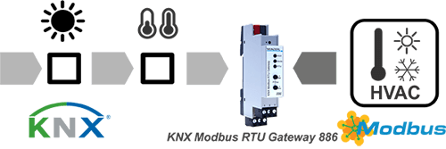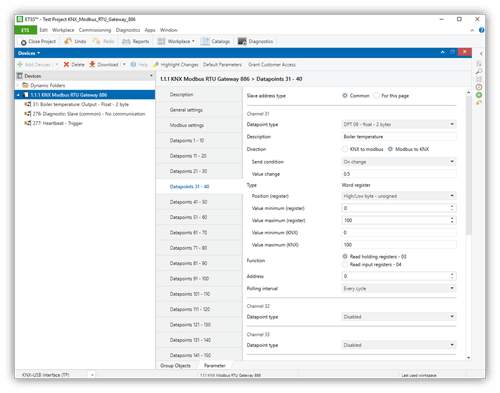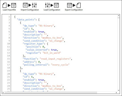 Dodela između KNX objekata i Modbus registara vrši se putem parametara u ETS-u - nije potreban dodatni alat. Konfiguracija se takođe može izvesti i uvesti preko DCA (Device Configuration App, SV ekstenzija u ETS-u). Uređaj omogućava interpretaciju i skaliranje Modbus podataka prema tipovima tačaka podataka KNX standarda.