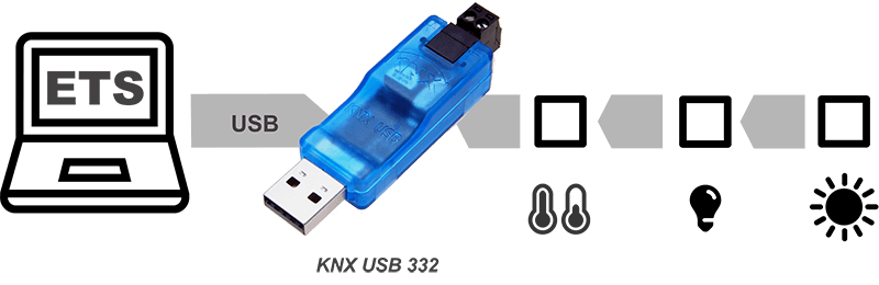 KNX USB Stick 332 je interfejs sa podacima između računara ili laptopa i KNX instalacione magistrale. Može se koristiti kao programski interfejs za ETS® softver verzije 3 (ili novije) i podržava KNX duge okvire. Dugi telegrami